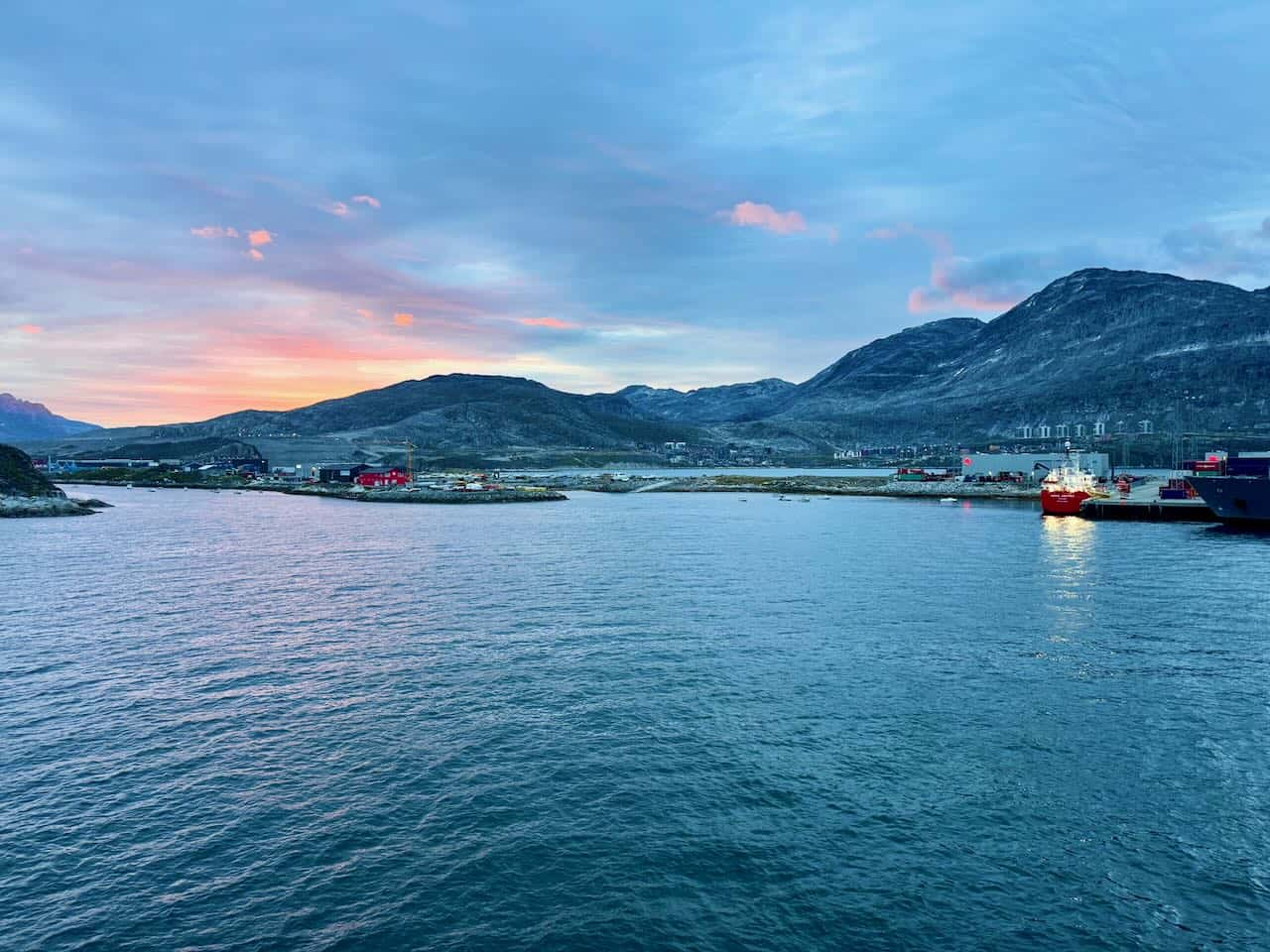 Morgens um sechs Uhr machte die MS Fridtjof Nansen bereits am Nuuk Cruise Terminal fest. Hinter den Bergen ging gerade die Sonne auf und färbte die Wolken am blauen Himmel rot.