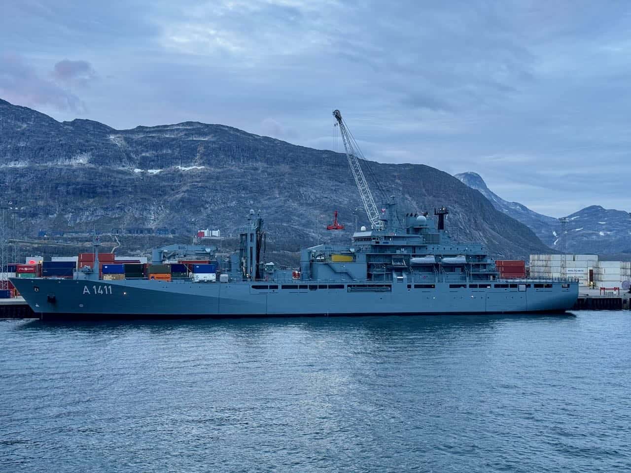 Uns gegenüber lag der Einsatzgruppenversorger Berlin der deutschen Marine, der hier im Rahmen der Übung Atlantic Bear am Vortag eingetroffen war. Es ist das erste Mal, dass ein deutschen Marineschiff einen grönländischen Hafen besucht. Nach kurzem Hafenaufenthalt nahm die Berlin Kurs auf Kanada, um an der Übung Nanook-Tuugaalik unter kanadischer Leitung teilzunehmen.