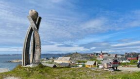 Dort befindet sich auch eine weitere Skulptur mit dem Namen „Inussuk“, ein Werk des Künstlers Niels Motzfeldt. Sie steht mit Blick auf den Kolonialhafen und den Fjord. Das Wort „Inussuk“ bedeutet „Steinhaufen“. Steinhaufen dienen oft als Wegweiser in den Bergen oder an den Fjorden. Die drei Säulen sind gewunden und lehnen sich aneinander. Sie symbolisieren die Menschen Grönlands im Norden, Osten und Westen – die sich verbinden und gegenseitig stützen.