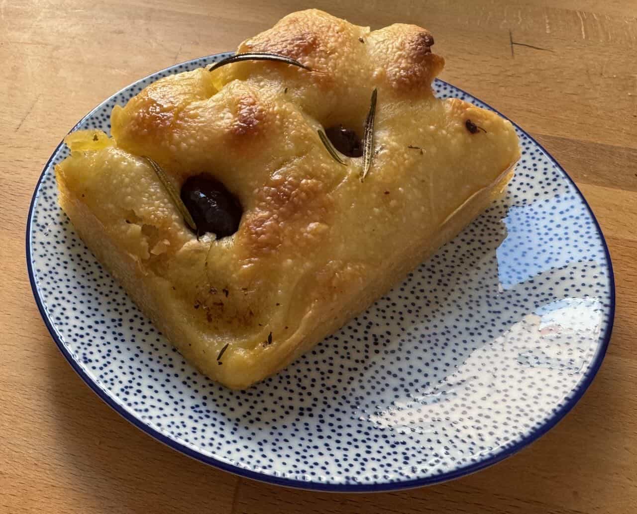 Selbstverständlich wird sie bei Domberger – so wie alles – mit Sauerteig gebacken, dazu kommen viel gutes Olivenöl, ein wenig Rosmarin und schwarze Oliven, die im Teig einsinken. Rund drei Zentimeter hoch und überaus knusprig ist sie die beste Focaccia nördlich der Alpen, die ich je gegessen habe. Ein Stück von circa zehn mal acht Zentimeter Größe ist ein feines, überaus köstliches Mittagessen.